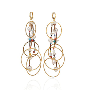 Part of our Lindy Collection, these earrings feature brass hammered rings plated in 18K gold, suspended from carefully chosen pearls and glass beads alongside coral, turquoise, and crystals. Their light, airy design evokes a refined yet effortlessly bohemian style. Finished with a secure lever-back closure, they measure 4.5 inches in length, offering both elegance and comfort.