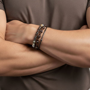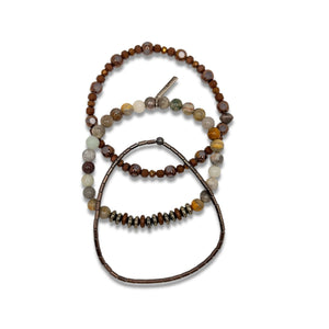 Three bracelets that play beautifully together—jasper's warm gray-to-brown palette meets rich hematite and complementary glass beads for a look that's equally stunning solo or layered with other pieces. Mix, match, and make it yours.