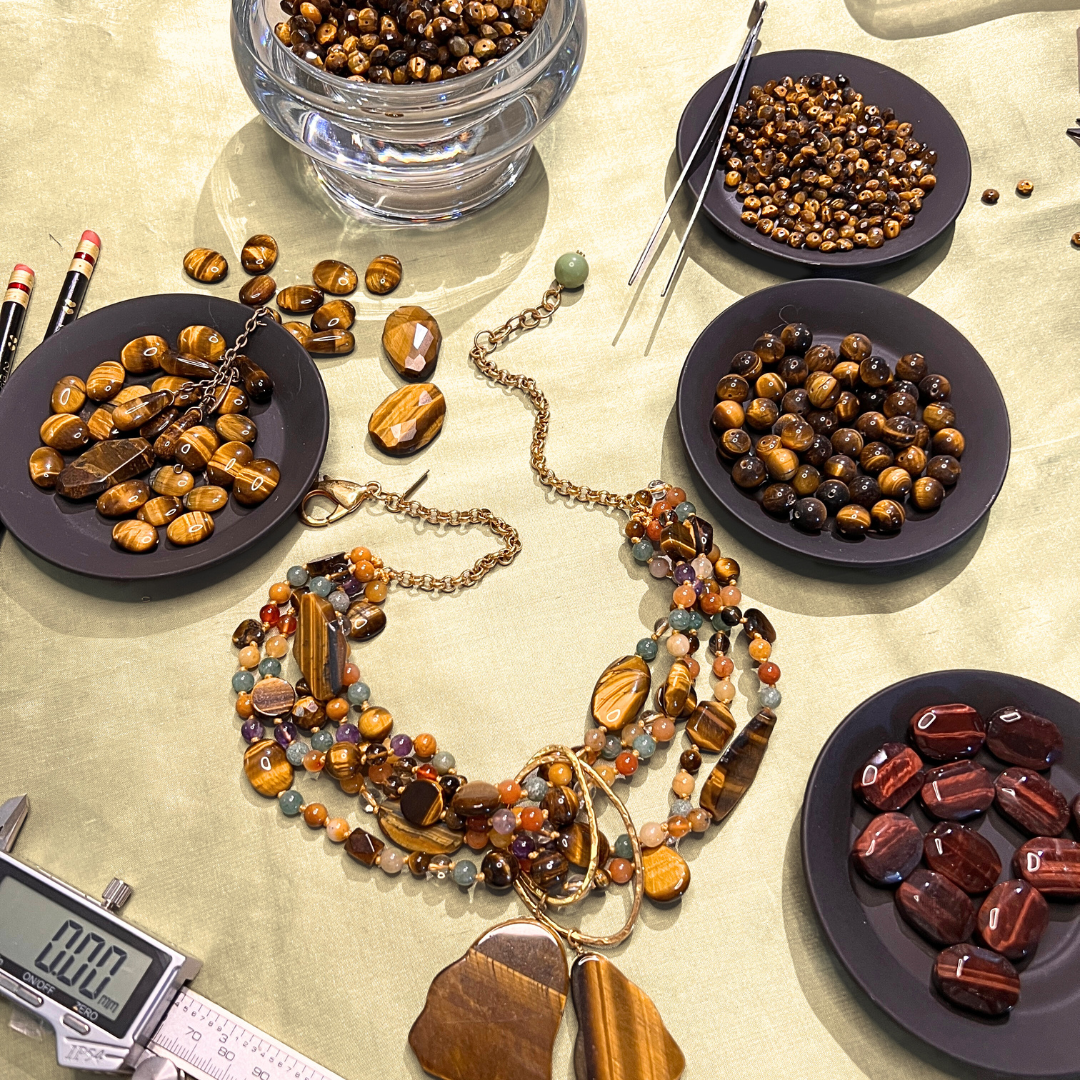 Tiger’s Eye brings bold visual texture and a warm, golden palette to statement pieces and beaded designs. Its layered surface catches light and attention, adding dimension to silhouettes that balance power with precision. In our designs, Tiger’s Eye stands out for its golden striations and tactile depth—often evoking strength and clarity.