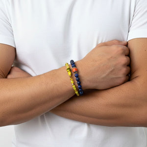 Two bracelets, twice the style. The first pairs deep lapis lazuli with gold-framed glass for understated elegance, while the second brings the energy with bright yellow and gold beads. Both feature elastic stringing for grab-and-go ease and coordinate with soft yellow leather cord accents. Wear them layered or separate—either way, your wrist wins.