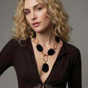 Este collar presenta cuentas ovaladas de latón y ónix texturizadas a mano, que le otorgan un encanto orgánico de inspiración vintage. Los eslabones ovalados están chapados en nuestro distintivo oro de 18 quilates, lo que le aporta un toque de brillo. Diseñado para ser versátil, el cierre de gancho ajustable puede llevarse en la parte delantera para crear un estilo en "Y" o en la trasera para un look tradicional. Mide 53 cm de largo y combina una elegancia atemporal con un estilo versátil.