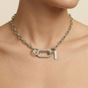 Nuestro cierre o mosquetón bañado en plata ( 32 x 17 mm ) realizado en pavé de La circonita cúbica (CV) aporta un toque glamoroso y ofrece versatilidad.