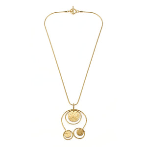 Dépourvu des auréoles traditionnelles, ce pendentif en laiton plaqué or 18 carats offre une silhouette élégante et minimaliste avec une présence imposante. Ce design polyvalent deux-en-un comprend un grand anneau, permettant au pendentif d'être facilement retiré et stylisé sur d'autres colliers. La chaîne minimale de 1 mm d'épaisseur peut également être portée seule pour un look raffiné et classique. Chaque pièce est dotée d'un fermoir à bascule signature et d'un revêtement électronique durable pour une brillance inaltérable et durable.