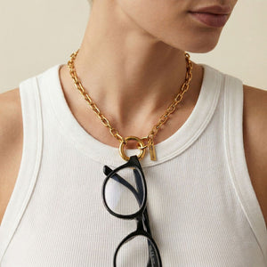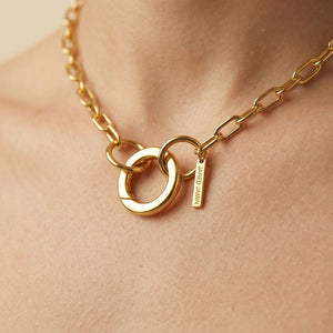 The Gold Chain Reaction Connector Necklace is a versatile, 18-inch evolution of our signature chunky chain aesthetic. Designed for the person who loves to play with their look, this necklace features an open-ended design secured by a central 21mm clicker clasp.