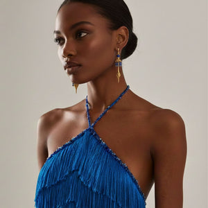 Make a statement with these whimsical umbrella earrings, featuring deep blue glass beads and crystals arranged in a hollow, cage-like design. Suspended from elegant leverback hooks, these 2.25" drops showcase Oriental-inspired artistry with a luxe 18K gold-plated finish that gleams with every movement. Perfect for adding a touch of playful sophistication to any look.